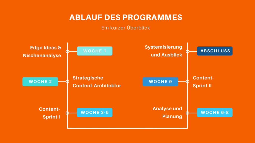 - Du bekommst 8 Wochen intensive Betreuung, 4 Custom GPTs, 30 produzierte Inhalte, eine Insight Bank, ein Strategic Brief und eine 6-Monats-Roadmap.